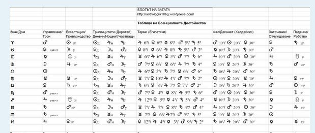 Астрологичен речник - таблица с есенциалните достойнства